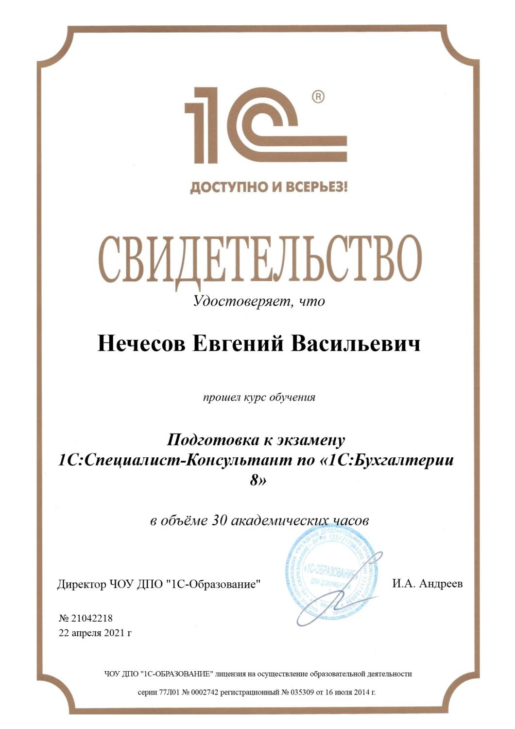 Свидетельство о прохождении курса «Специалист-Консультант по 1С:Бухгалтерии»